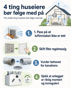 For huseiere handler godt vedlikehold ofte om enkle rutiner: sjekk luftinntaket, skift filter, følg med på ventiler og få faglig hjelp når noe virker feil.